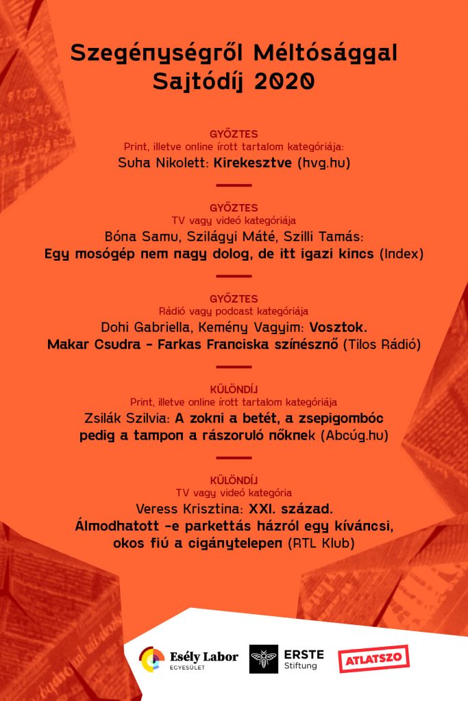 Egyik különdíjasunk Zsilák Szilvia lett az abcug.hu-n megjelent egyik cikkével: “Magyarországon a nők harminc százalékát érintheti a menstruációs szegénység, és egyáltalán nem csak szegény falvakban fordul elő. Arról kérdeztünk érintett nőket, hogyan vészelik át a havi vérzést. Igaz, egyre több az adomány, azonban a menstruációs szegénység egy olyan probléma, ami továbbra is komplex megoldásra vár. ” A díjazott szerző dolgozott az Index és az Abcúg újságírójaként. Az Abcúg finanszírozási okokból tavaly december végén megszűnt, így Szilvia januártól az Átlátszónál folytatja tovább a munkát.